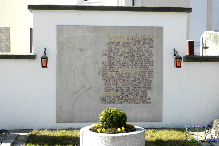 Gedenktafel in der Pfarrkirche Mariä Himmelfahrt, und Denkmal an der Friedhofsmauer |