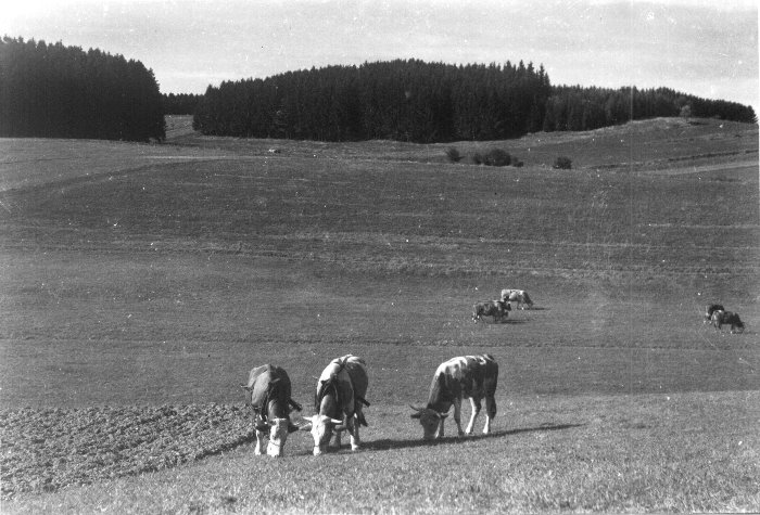 Liesl, Scheck und die Braune die Scheck und die Braune dürften sich nach dem Ackern etwas erholen Wie sollten die viel Milch geben, erst wurden sie zum Ackern vorgespannt, dann vor den Wagen, denn wir hatten weder Ochsen, Pferde oder einen Traktor Wenn das Ackern schwerer war, hat uns ab und zu der Waldberger Bäcker (d'r Bäck) seine beiden Ochsen ausgeliehen |