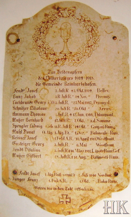 | Gedenktafel an die Dienstzeit von Bonifaz Reißer (Dachbodenfund in Reinhartshofen durch Franz Stahl) | |||||||