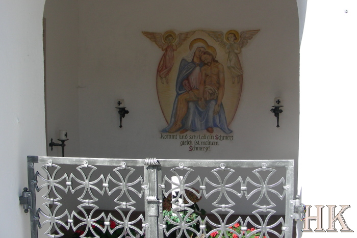Gedenktafeln in einem offenen Außenraum der Pfarrkirche |