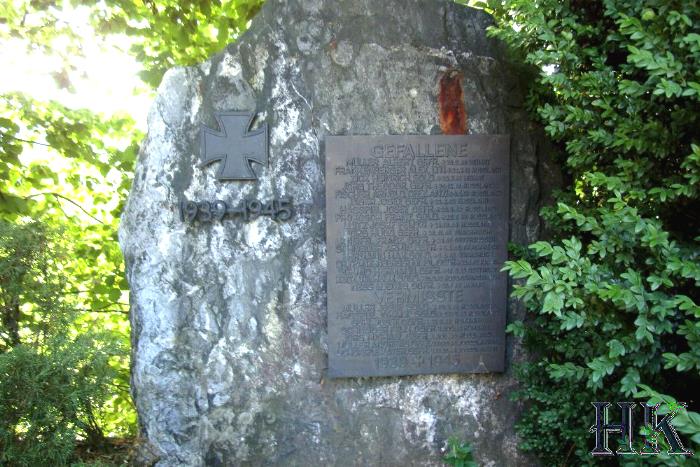 1. Findling mit Eisernem Kreuz und Gedenktafel für die Gefallenen des 2. Weltkrieges westlich der Filialkirche St.Antonius Einsiedler 2. Zwei Gedenktafeln für die Gefallenen beider Weltkriege im Vorraum der Kirche. |
