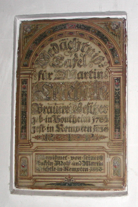 Gedächtnißtafel in der Kirche, an den Brauereibesitzer Martin Schichtle geb. 1762 in Sontheim gest. 1836 in Kempten |