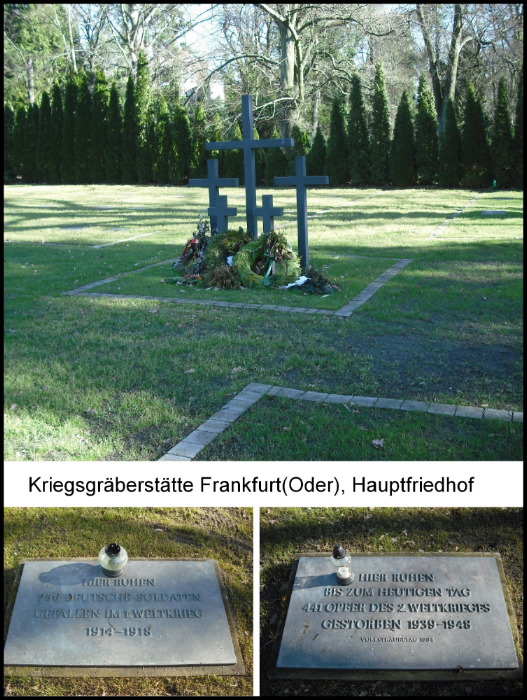 Auf dem Hauptfriedhof Frankfurt an der Oder (ca. 20 ha groß) der Zentralen Kriegsgräberstätte des I. und II. Weltkrieges sind über 7600 Soldaten und Zivilinternierte beigesetzt. Hier endeten auch die Heimkehrertransporte der schwerkranken Kriegsgefangenen aus Sibirien, die man vorzeitig nach Deutschland entlassen hatte. Viele von ihnen schafften den weiten Weg nicht mehr, und wie Zeitzeugen berichteten, wurden die Verstorbenen bei jedem Zughalt aus den Waggons geworfen – ohne Begräbnis. Die Transporte endeten in Frankfurt an der Oder, und die Heimkehrer kamen dort in die ehemalige „Hornkaserne der deutschen Wehrmacht“, die unter sowjetischer Verwaltung stand, wieder in Gefangenschaft. Es folgten dann Verhöre, und nur wenn keine Kriegsverbrechen nachgewiesen werden konnten, wurden die Gefangenen für eine Heimfahrt, soweit sie überhaupt möglich war, entlassen. |