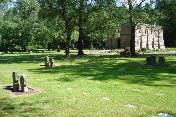 In der aktuellen Liste sind 2.421 fortlaufend nummerierte Einzelgräber erfasst. Teilweise konnten die dort beigesetzten Personen bis heute nicht identifiziert werden. Anderseits zählt die Liste 184 Personen auf, deren Grab sich auf dem Ehrenfriedhof nicht genau lokalisieren lässt. Unter ihnen werden sich auch Tote im Sammelgrab um die Krypta befinden. Hier wird mit 41 Toten gerechnet, die genaue Anzahl der unbekannten Militär- und Zivilpersonen in diesem Grab ist jedoch unbekannt. (Text aus dem sehr zu empfehlenden Buch: Kriegsgräberstätten im Kreis Kleve). |