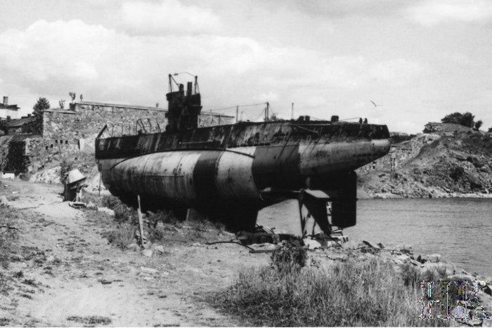 Ein ausgestelltes deutsches U-Boot das im flachen Wasser versenkt war und von den Norwegern gehoben wurde |
