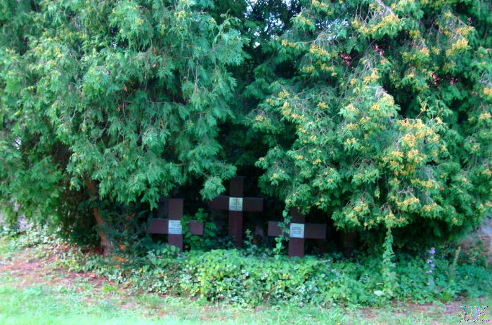 3 Kreuze für 5 Gefallene an der Friedhofsmauer zum Pfarrhof nordöstlich der Kirche